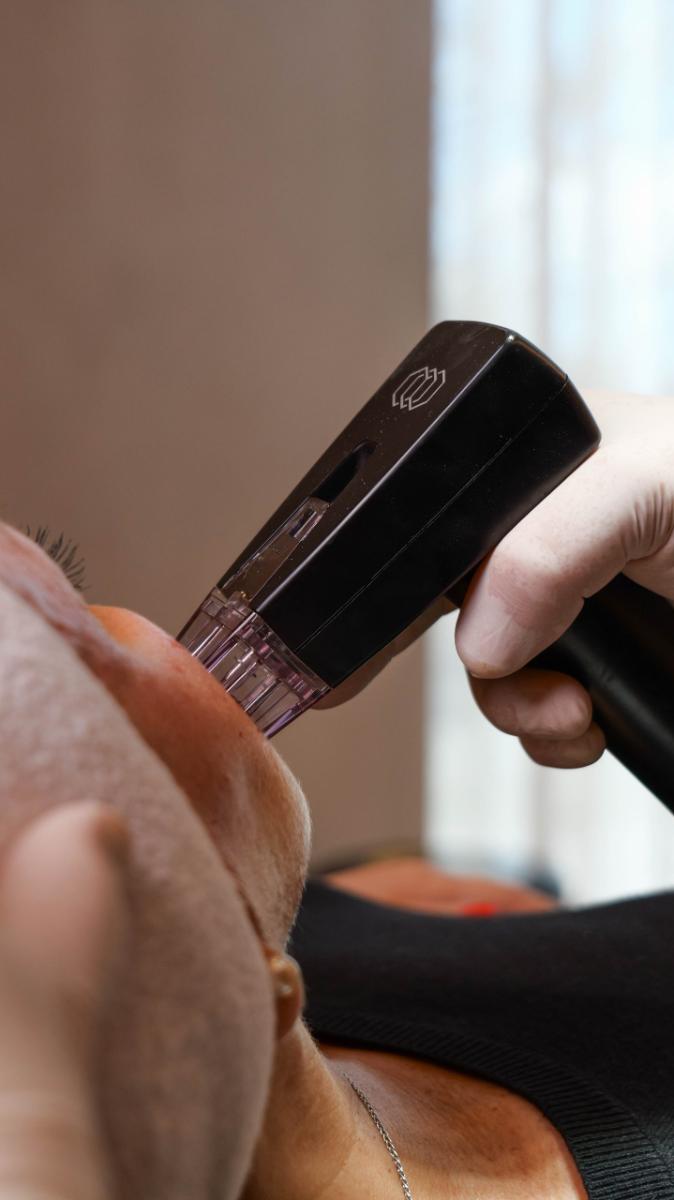 O Morpheus8 utiliza agulhas revestidas que penetram até 4 mm na pele, associadas a um perfil térmico adicional de 1 mm. A radiofrequência aquece as camadas subdérmicas, estimulando a produção de colagénio e elastina, resultando numa pele mais firme e rejuvenescida.